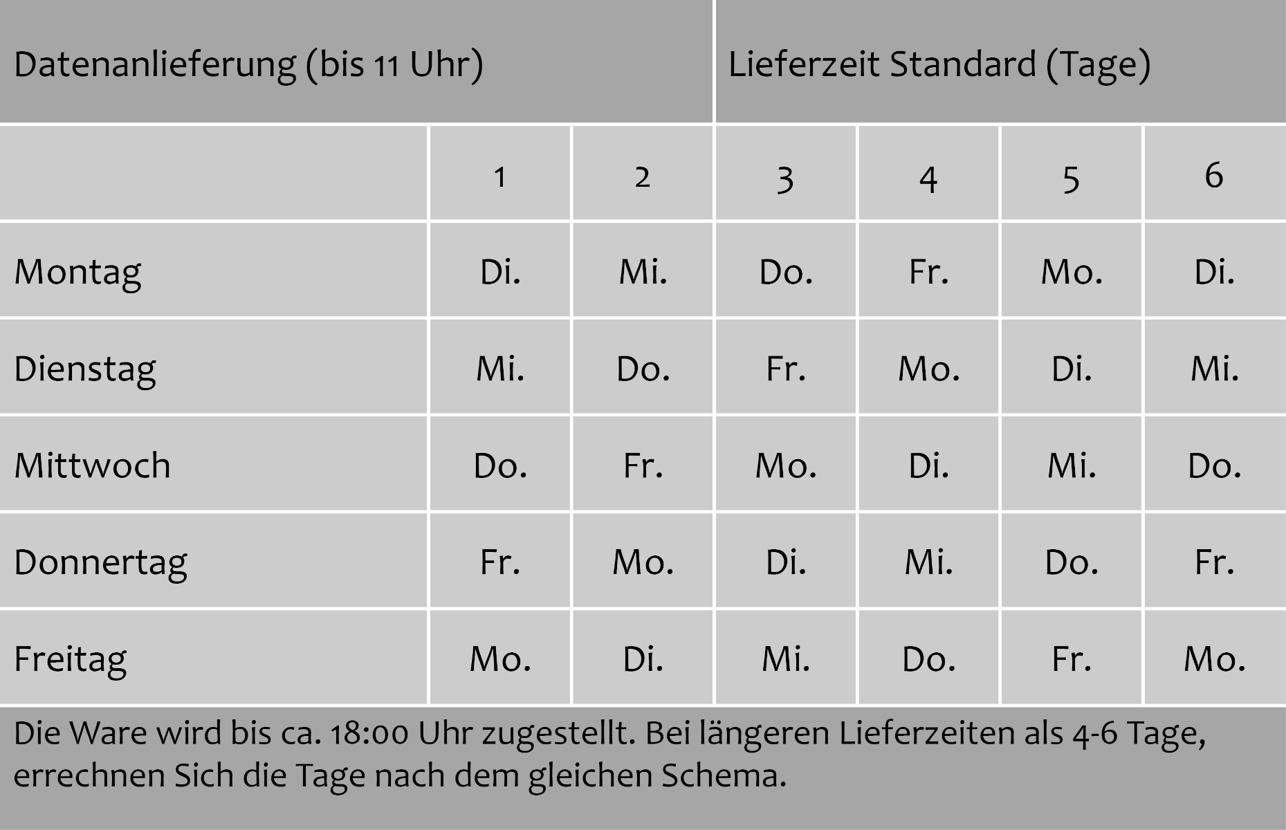 Wir drucken täglich in den Standardgrammaturen. Daraus ergeben sich folgende Lieferzeiten (die Liefer- und Produktionszeiten, sowie die Preise gelten für eine frei Haus Lieferung in Deutschland (Festland). Bei Inselzustellungen kann es zu verlängerten Laufzeiten, sowie Zusatzkosten für Inselzustellung kommen – bitte frage dies individuell an).