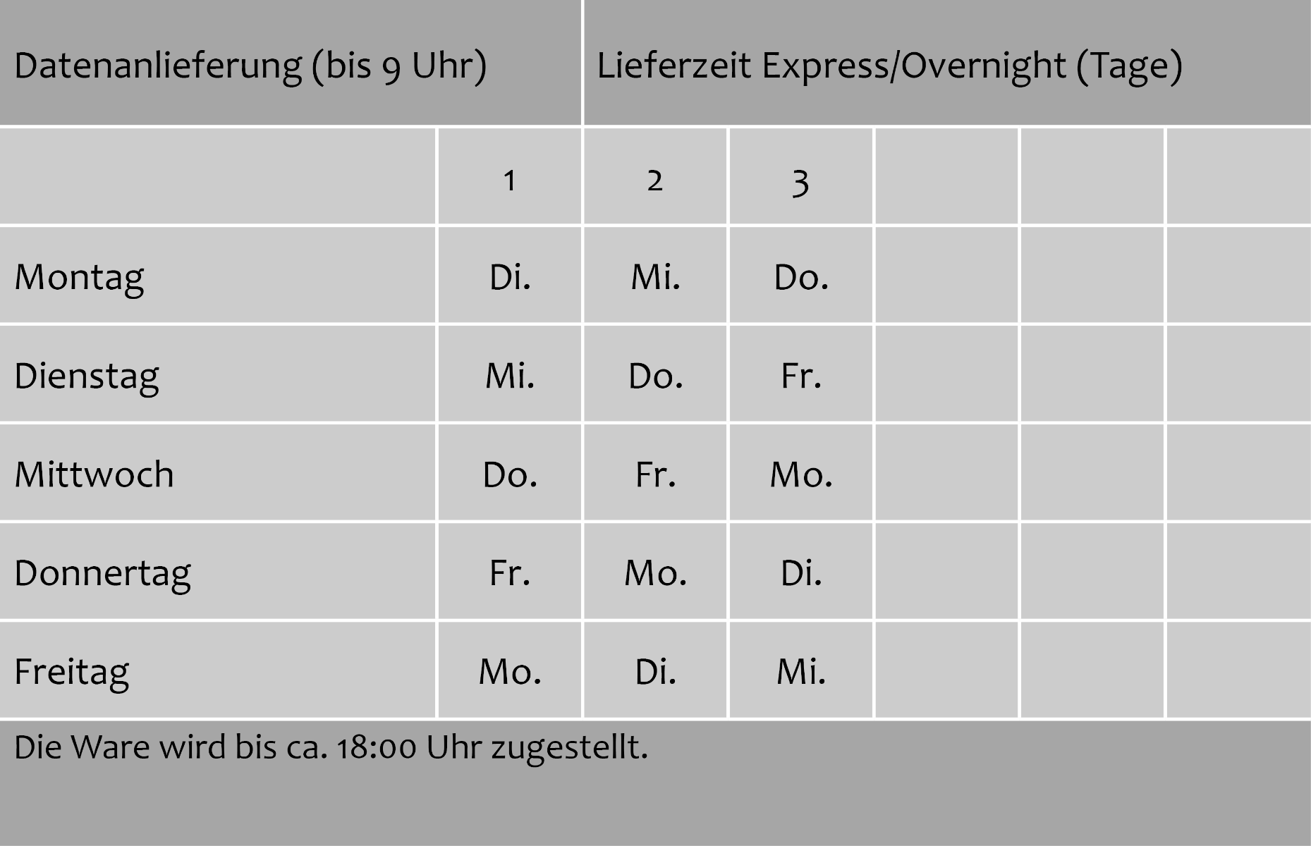 | Express: | Auftrags- und Datenannahme bis 12.00 Uhr |